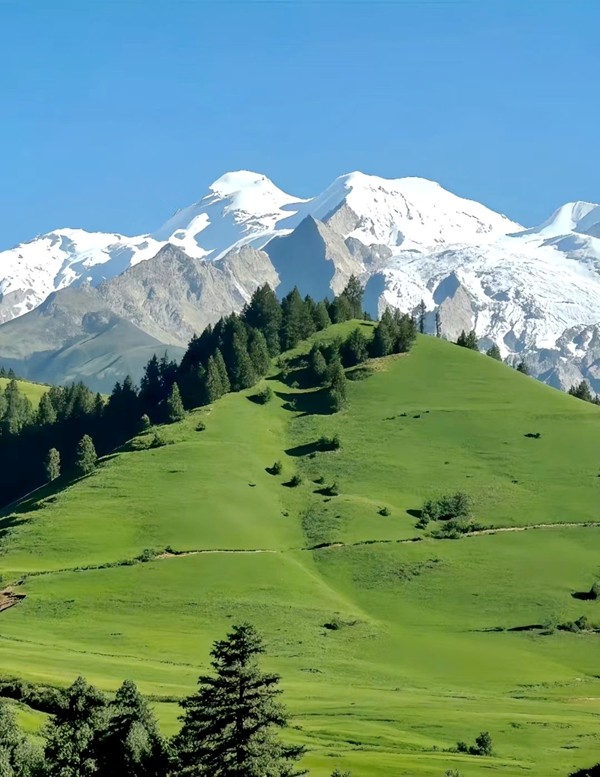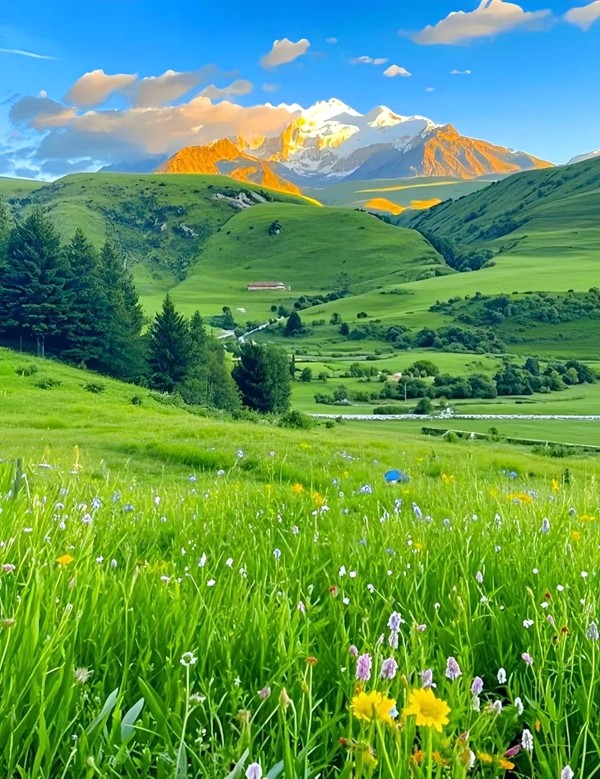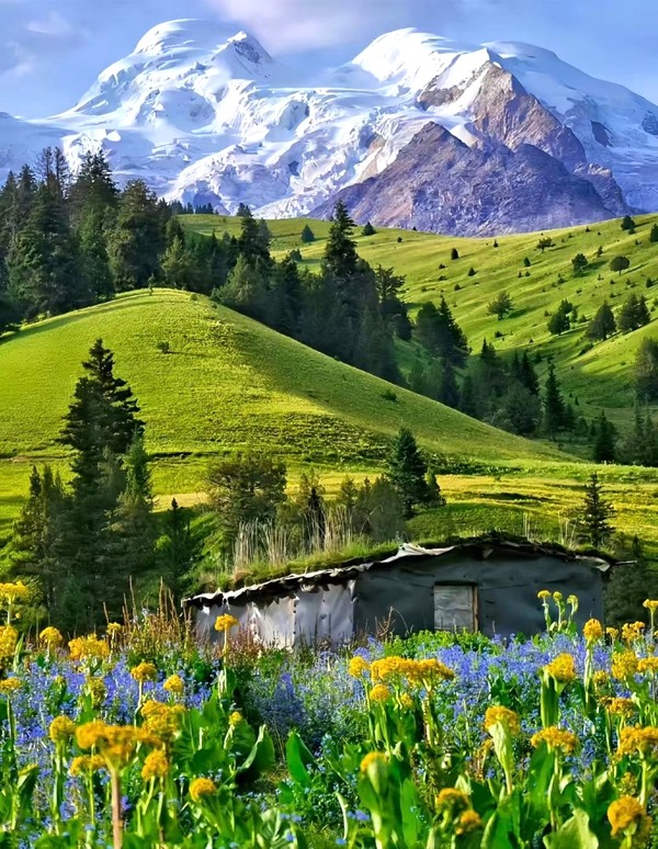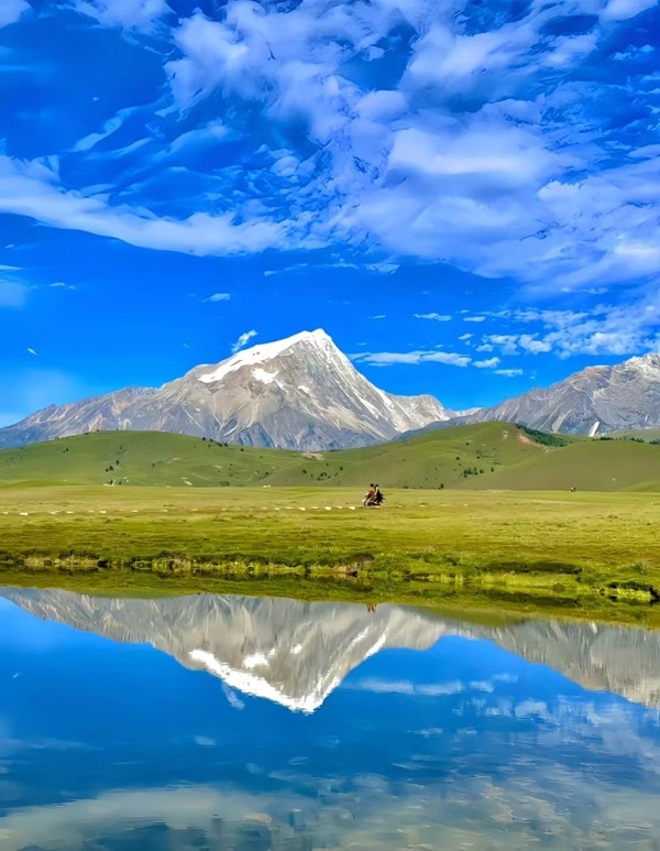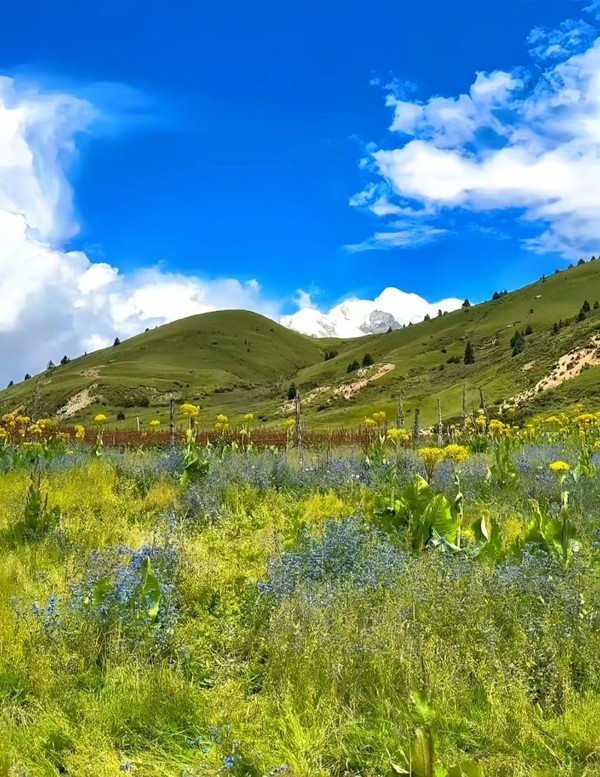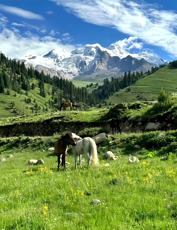 格聂,这座神山耸立于四川理塘,海拔6204米,是沙鲁里山脉主峰,藏传释教的圣地。进入盛夏,雪山映衬着无边的花海,冰川融水汇成清亮溪流。草甸似翠缎延展,野花遮掩其间,野马悠闲闲步,如一幅巨美的画卷铺睁开来。(郑小楠)